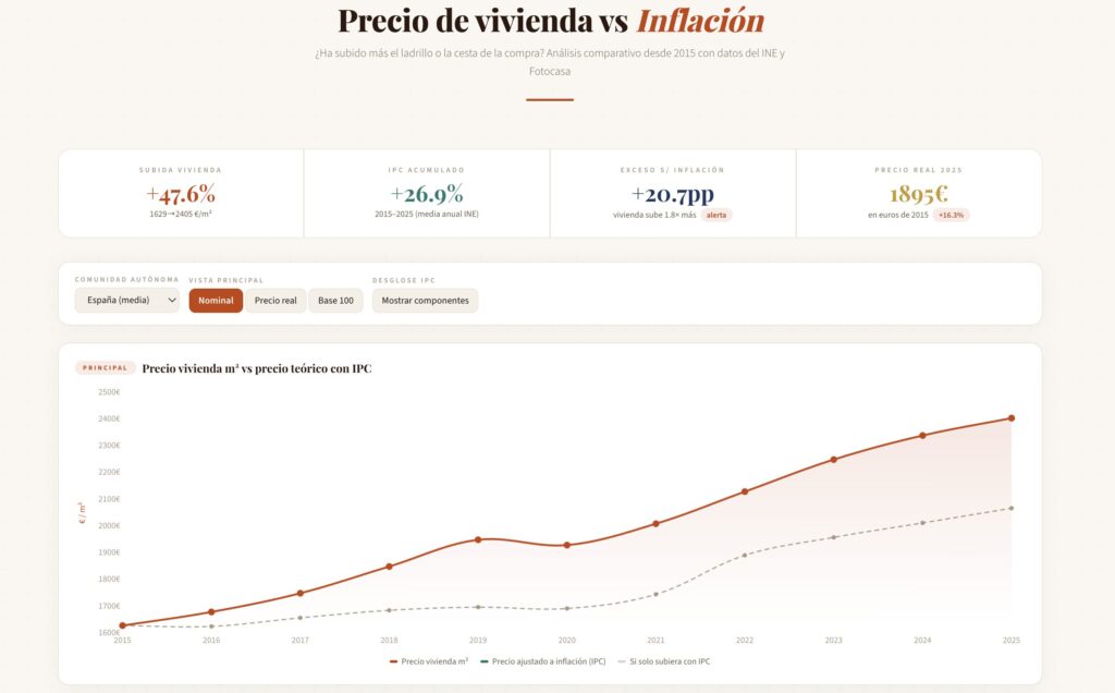 (Fuente: elaboración propia con Claude a partir de datos del INE y Fotocasa. Por cierto, Claude Opus 4.7 es la bomba para cruzar datos y montarte gráficos interactivos potentes.)