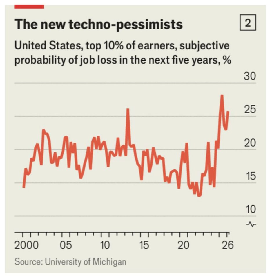 En The Economist leía la semana pasada que con la IA y el avance de la tecnología la probabilidad de que los altos salarios pierdan su trabajo en los próximos años se encuentra en niveles máximos. Se ha triplicado esa probabilidad respecto a la situación que había justo después de la pandemia.